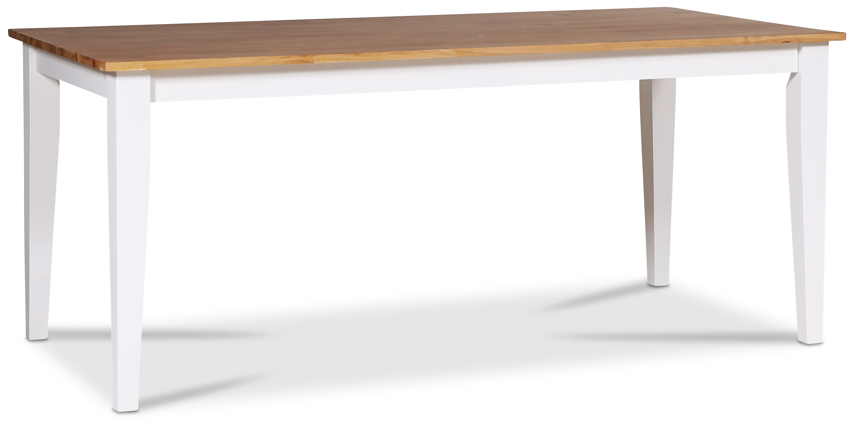Matgrupp från Skånska Möbelhuset, matbord med ek-underrede och bordsskiva i massiv oljad ek. Fyra stycken Dalarös matstolar i vitlackat trä med kryss i ryggen.