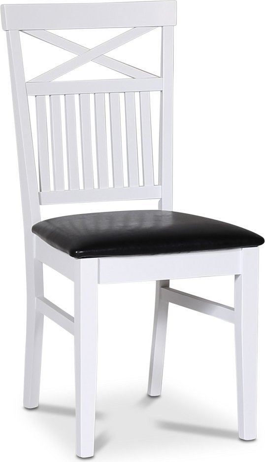 Fårö matgrupp från Skånska Möbelhuset, klassiskt matbord 140x90 cm med vitt underrede och en toppskiva i oljad ekfanèr. Det ingår 4 stycken matchande Fårö matstolar med kryss i ryggen och sits i svart PU. Stol i vitlackat trä.