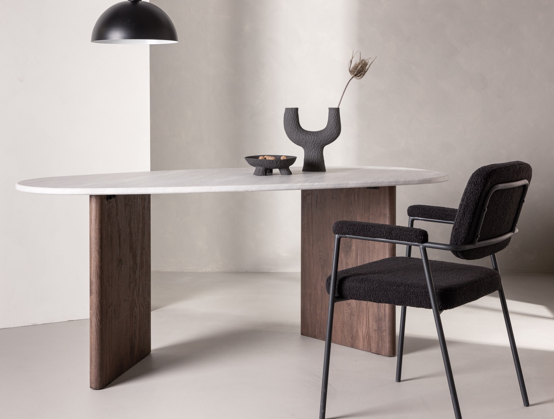Matbord som snabbt skapar ett smakfullt blickfång i ditt hem! Med sin skandinaviska design och eleganta utformning blir det här bordet en favorit i de flesta hem. Den oregelbundna bordsskivan är i ljusgrå MDF med betong-look och bärs upp av två tunna träskivor i mörkbrun kulör. Matcha med ett par snygga matstolar så får du en komplett matgrupp till alla härliga måltider framöver!