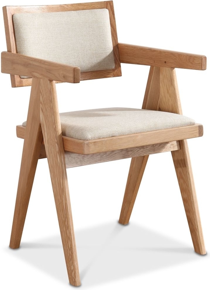 Sara karmstolar är tillverkade av FSC-certifierad massiv ek och klädda i ett linnefärgat tyg som skapar en varm och inbjudande känsla. Den integrerade armstödsdesignen ger extra komfort, medan de rena linjerna och naturmaterialen gör att stolarna passar perfekt till bordets klassiska form.