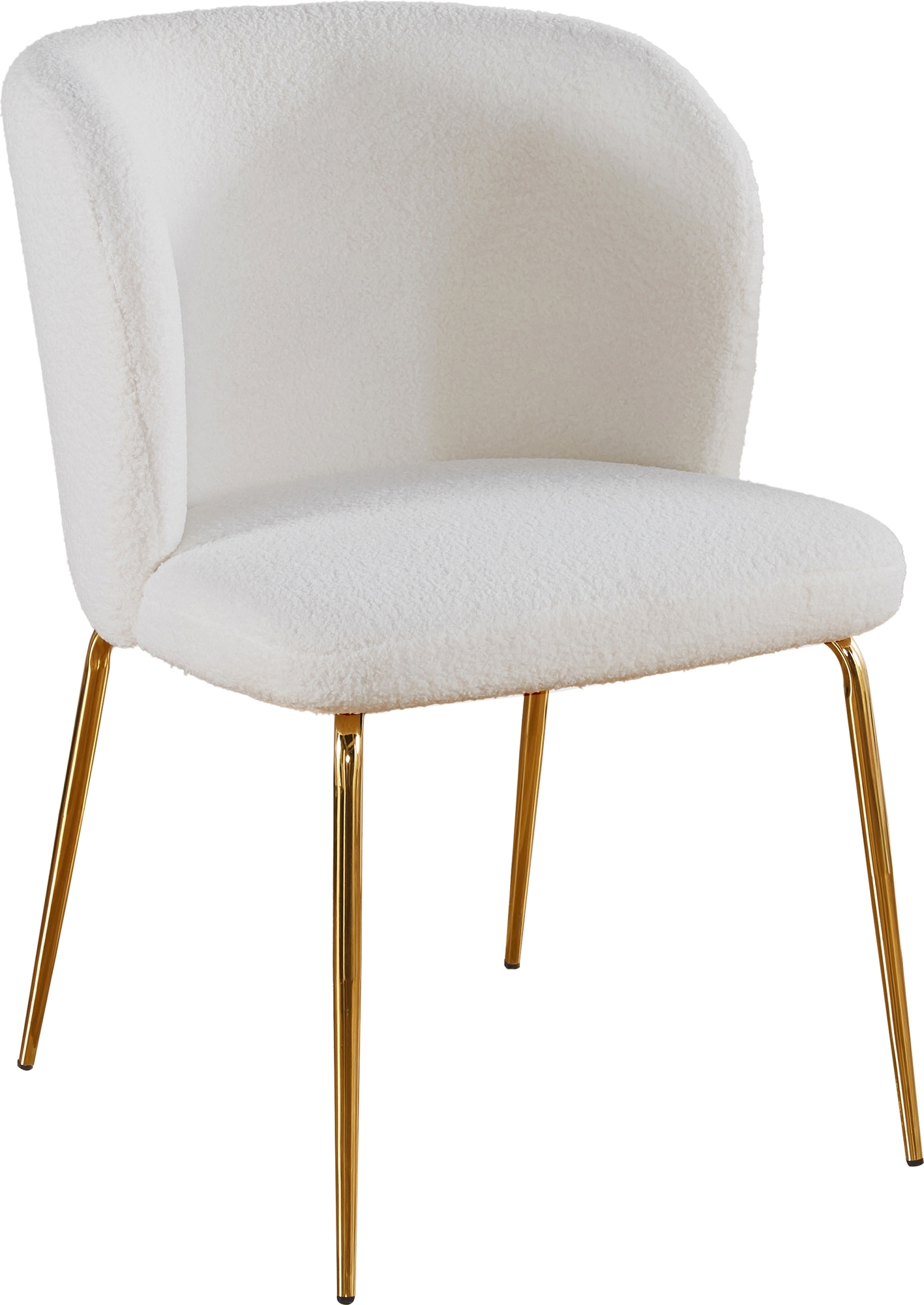 Stolarna är klädda i bouclètyg i färgen cream och har ett underrede i mässingsutförande. Kombinationen av träbord och textilklädda stolar ger en funktionell och stilren matplats för fyra personer.