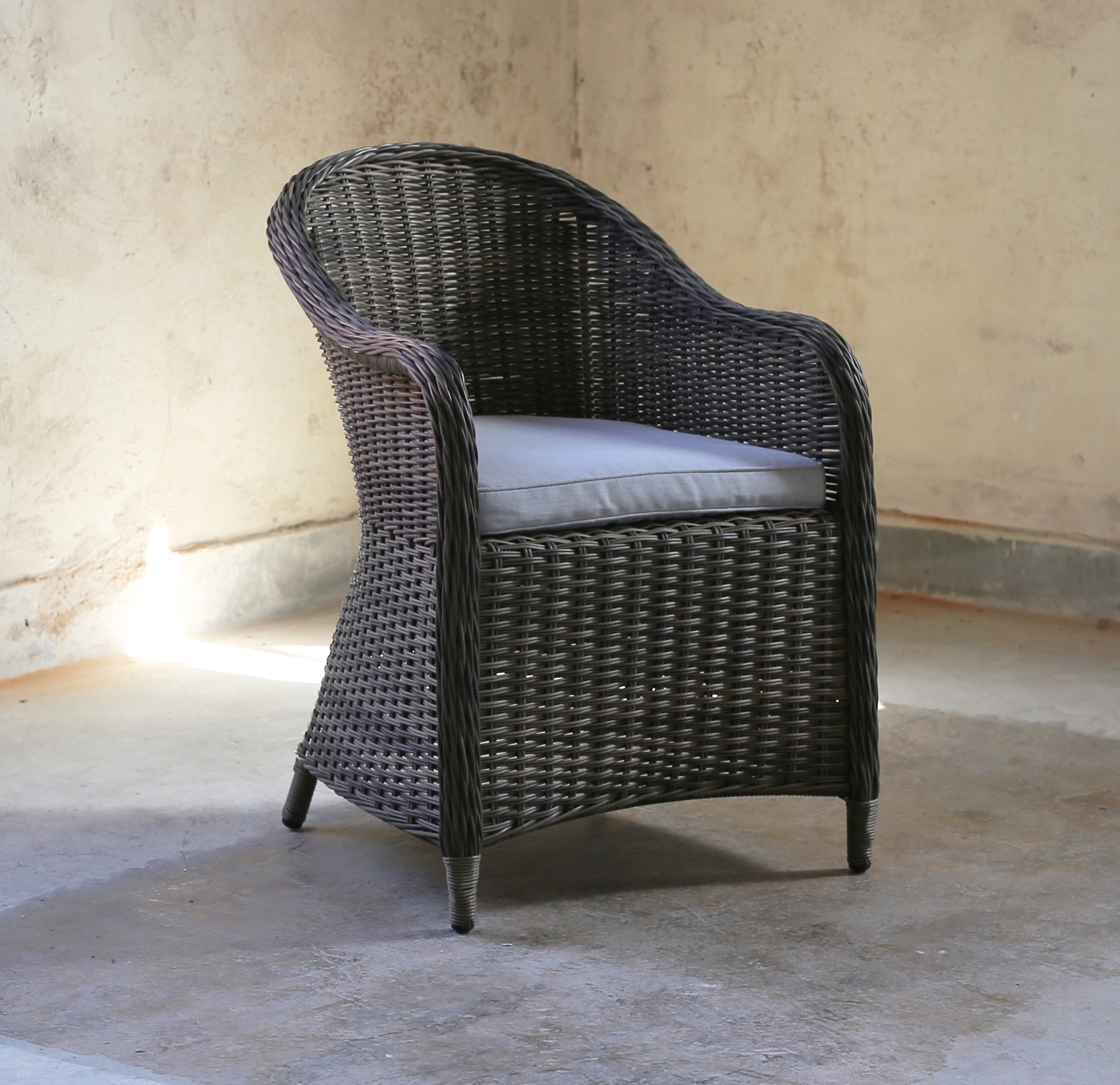 Stor och rymlig matgrupp för uteplatsen, stolar i ljusgrå/brun konstrotting med gråbeige sittdynor. Bord av gråpolywood med kryssben i vit aluminium för att ge en stabil känsla och ett väderbeständigt uteset.