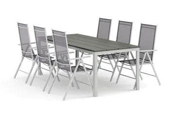 Tunis utomhus matgrupp 205x90 cm med 6 Maggie positionsstolar, Vit/Grå