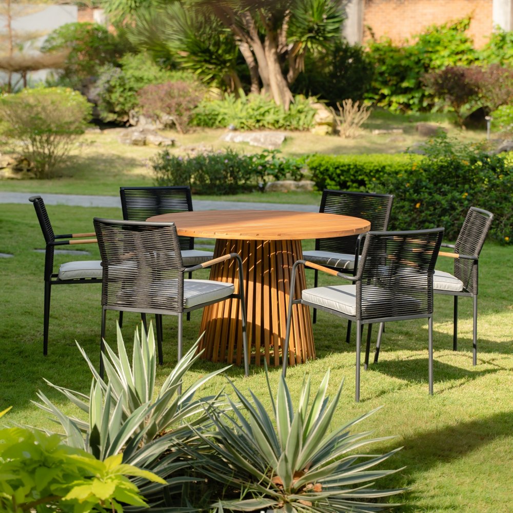 Saltö matgrupp för uteplatsen med ett runt matbord i massiv teak, tillsammans med fyra stycken stolar i massiv teak. En klassisk kombination.